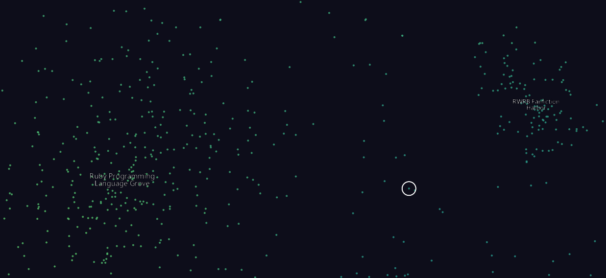 Next, zoom in a bit and see where our account sits within the larger subculture clusters. We’ll use this to inspire the larger-scale culture the system find itself within or between. If your account is in the “Ruby Programming Language Grove” cluster, what does that say about the culture at large? It’s likely highly technology rich, perhaps fairly advanced, and may value soft skills and software over physical labor and hardware. If your account is part of a "Animation Enthusiasts” cluster, the superculture may be one embracing the arts, public merriment, and supporting culture over tech. Accounts sitting outside of a discrete cluster I envision as being “outer rim” style settlements. These are one of the many places between - either lacking in a distinct culture or filled with subcultures that have taken to a location off the beaten path.